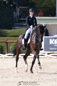 Zum Ritt von der neuen Europameisterin: 75,590 Prozent - das bedeutete ein persönliches Bestergebnis für die beiden. Und es war eine Vorstellung vom Allerfeinsten. Der Auftakt mit Einreiten, Halten, Grüßen - besser hätte man es nicht machen können. In den Piaffen könnte der Württemberg noch etwas mehr Fleiß zeigen, da gerät er immer mal leicht ins Stocken, aber in der zweiten war es schon besser als in der ersten. Toll die Passagen, mit ganz viel Power, die Schritttour deutlich besser als gestern. Wie schon am Vortag überzeugte Sunfire in der Galopptour mit viel Go nach oben und vorne. Die Einerwechsel waren leicht schwankend, aber sicher gesprungen. Das war ein Ritt, mit einer jungen Dame im Sattel, die ihr reiterliches Können unter Beweis stellte und mit ihrem Partner eine perfekte Einheit bildete. Stark!